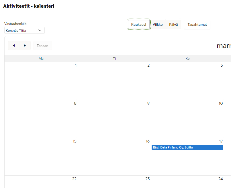 Kalenterin pohjatietoina voivat olla projektit, tehtävät, aktiviteetit jne. eli kaikki aikamääreiset hakuraportit.
